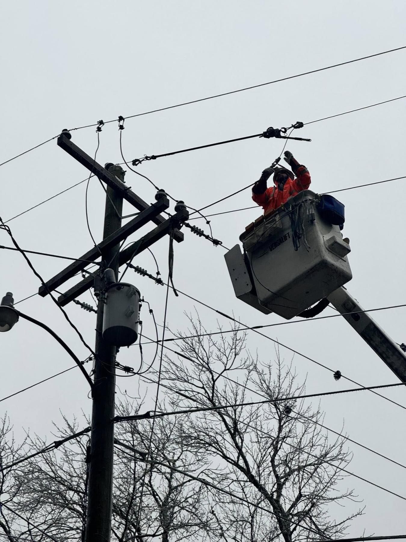 Linemen with the Jackson Energy Authority work restore power and ensure lines will not be snapped as a result of the storm. (Photo by Jackson)